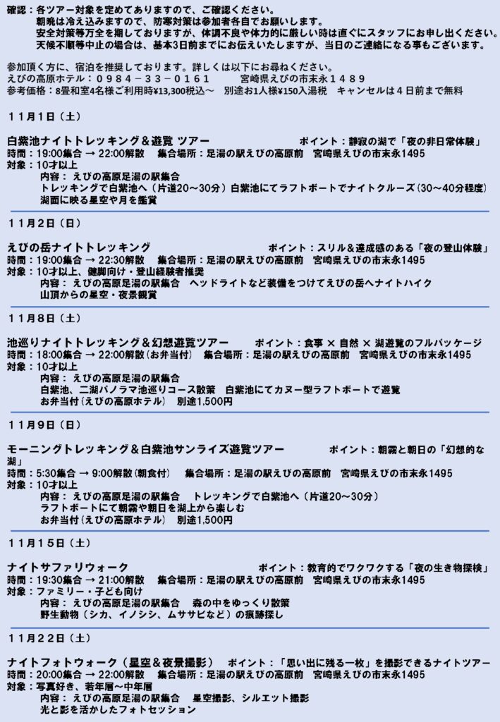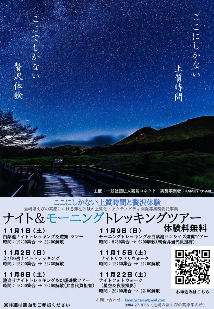 えびの高原で、「ナイト&モーニングトレッキングツアー」が開催されます。特別で贅沢で上質な時間を体験してみませんか。詳細はチラシをご覧ください。