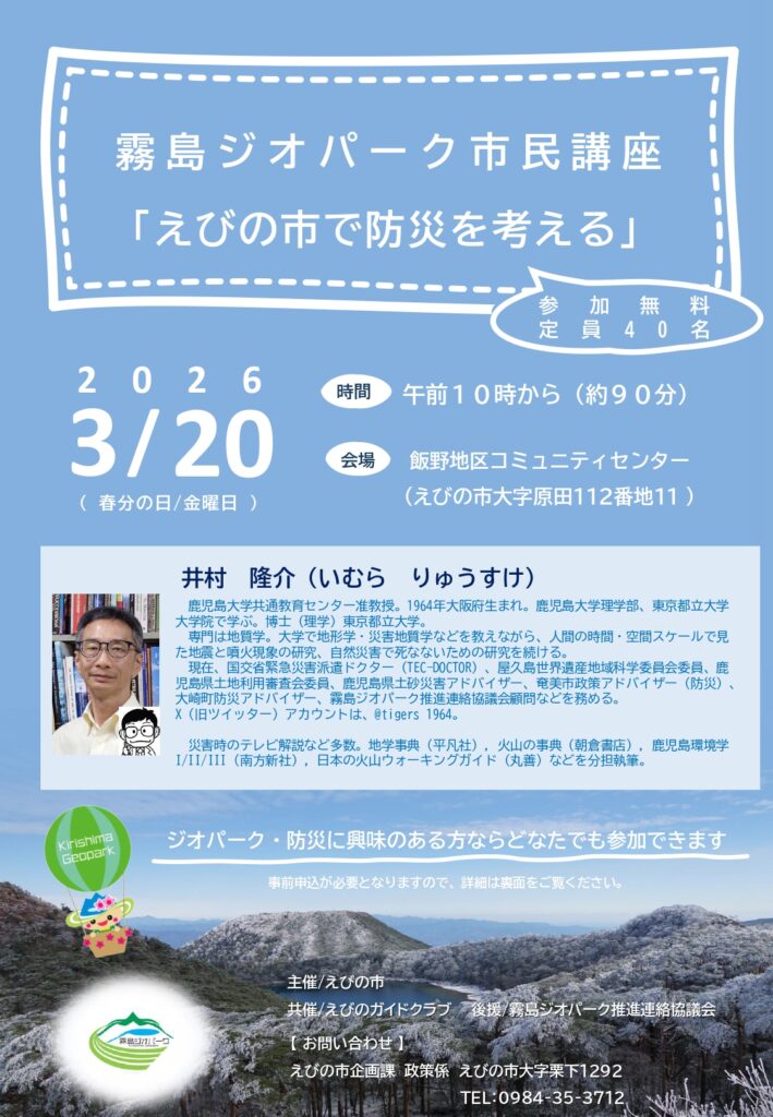 「えびの市で防災を考える」をテーマに講演が行われます。ジオパーク・防災に興味のある方ならどなたでも参加できますので、是非、お申込の上ご参加ください。