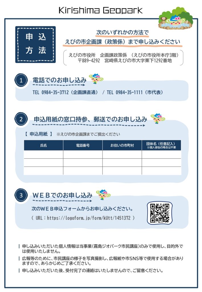 【申込み方法】 ①電話0984-35-3712(企画課直通)、0984-35-1111(市代表) ②WEB申し込み(WEB申込フォーム)、③窓口へ申し込み書(チラシ裏面)持参もしくは郵送