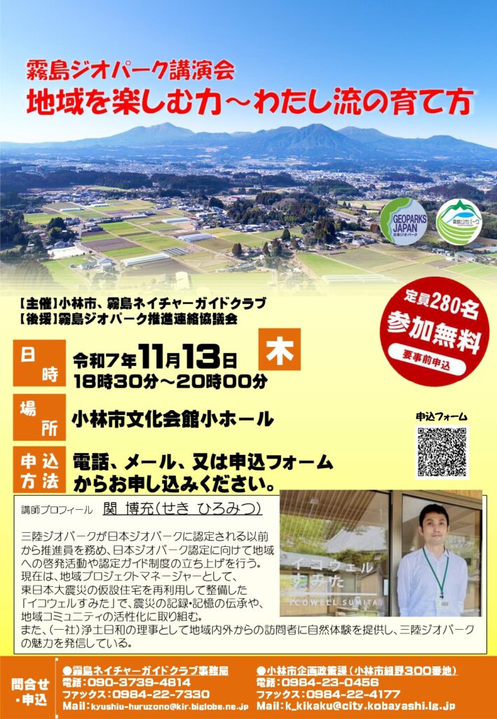 小林市では、霧島ジオパークの魅力を見つめ直し、地域資源の活用や保全、ジオパークを活用した地域づくりなど、そのきっかけや手段について、先進事例から地域の皆さんと学ぶことを目的に講演会を開催します。